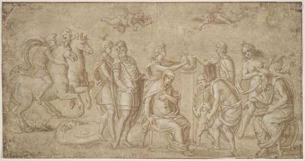 Editor: This drawing, "Noah, his Family and the Animals Leaving the Ark," is by an anonymous artist. It depicts the biblical scene with delicate lines in brown ink. It feels like a moment of hope and renewal, but what do you see in this work, especially considering its historical context? Curator: I see a powerful intersection of faith, family, and the environment. The depiction of Noah’s family highlights the importance of lineage and continuation, resonating with societal structures that often prioritize patriarchal narratives. But what about the animals? Editor: They seem to represent a chance to rebuild what was lost. Curator: Precisely, it prompts questions about our own responsibilities in the face of environmental catastrophe. Who gets saved, and who gets left behind in our modern "arks?" What do we owe future generations in terms of the planet we leave behind? Editor: It's incredible how a seemingly simple drawing can spark such complex thoughts. Curator: Art is a mirror reflecting our values and challenging our beliefs, and that is invaluable to how we interact with the world around us.