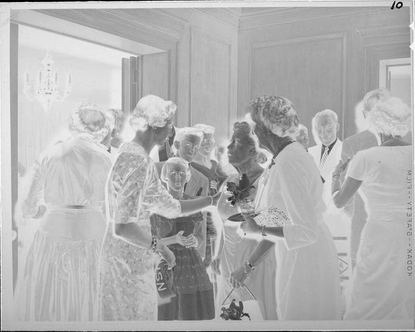 Curator: The photograph before us, simply titled "Untitled (people smiling, standing in front of chairs)," was created by Lucian and Mary Brown. Its starkness feels quite striking, doesn’t it? Editor: Yes, the composition immediately strikes me as somewhat theatrical, almost like a stage set. The figures are arranged with a careful awareness of space and light. Curator: The gathering of people, their smiles—it speaks to a shared moment, perhaps a celebration. The chairs, though inanimate, suggest structure and tradition. The negative exposure enhances its feeling of a memory being brought to the surface. Editor: I'm drawn to the high contrast and inverted tones. It adds an element of abstraction, pushing beyond straightforward representation to something more dreamlike, perhaps even slightly unsettling. Curator: The smiles do have that slightly forced quality that you often see in photographs from a specific era. It echoes certain social conventions, almost a ritual of happiness that was performed for the camera. Editor: Exactly. It's fascinating how the formal elements—the light, the composition—interact with this staged emotion. It invites us to question the very nature of photographic truth. Curator: Indeed. It’s a window into not just a family gathering, but the customs and expectations of that time. Editor: This artwork leaves me pondering the relationship between documentation and artifice. Curator: And for me, it's a poignant reminder of how visual symbols can evoke entire worlds of feeling and memory.