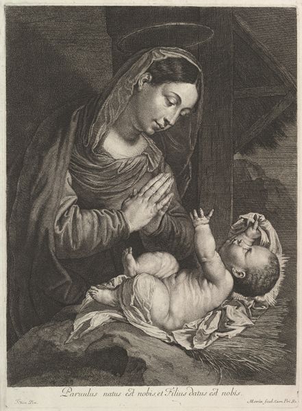 Editor: Here we have Manuel Salvador Carmona’s 1757 engraving, "Maria met het Christuskind," or "Mary with the Christ Child". The piece has a very reverent feel to it, with the Virgin Mary gazing upwards, and Christ looking forward. I'm curious, what are some of the more prominent symbols that stand out to you? Curator: It's fascinating how Carmona uses established visual language here. Note Mary's gaze upwards, toward divine light. This upward direction is a classic visual cue. Her posture evokes humility, acceptance of divine will, doesn’t it? And the child, paradoxically both dependent on Mary and also the source of that very light above? The column behind also signifies strength, steadfastness...almost a support. The composition here is quite revealing, no? What do you see? Editor: I guess I didn’t realize how much the gaze contributes to the narrative! The contrast between Mary's softness and the hard, architectural column is now really noticeable, acting like a firm foundation as you say. Curator: Exactly. Also, observe the swirling clouds in the background; do those shapes and forms evoke a certain mood for you, compared to say, the sharp lines of the engravings in the foreground figures? Editor: Yes, the background clouds make me think of Baroque art, which is all about high drama and movement, but the column and clean lines keep it very formal, like a portrait. It’s almost a meeting of styles to create a highly complex statement! Curator: Precisely. Engravings such as these offered access to devotional imagery across wide audiences – replicating familiar archetypes that have roots far into the medieval past. We begin to comprehend cultural continuity and change, wouldn’t you say? Editor: Absolutely. It is amazing to see how one piece can weave so many art styles together and preserve cultural meaning, all at once.