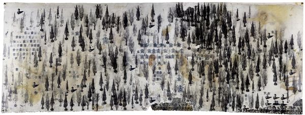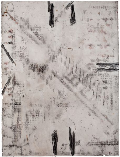 Pavlo Makov made 'Back to Krasny Kut' using a kind of wash technique, almost like he's staining the paper to create these rows of almost tree-like shapes. The colors are muted, mostly browns and blacks, except for this jolt of red in the center that's really eye-catching. The surface of the paper looks aged and distressed, like it's been through something. I think Makov is using this technique to suggest memory and history, the way things fade and change over time. Take a look at the way the dark marks bleed into the paper. It feels kind of melancholic, doesn't it? Like a landscape seen through a rain-streaked window. It reminds me a bit of Anselm Kiefer, in the way he uses material to evoke a sense of loss and the weight of history. But Makov's touch is lighter, more delicate. Ultimately, it's about layers, both of paint and of meaning.