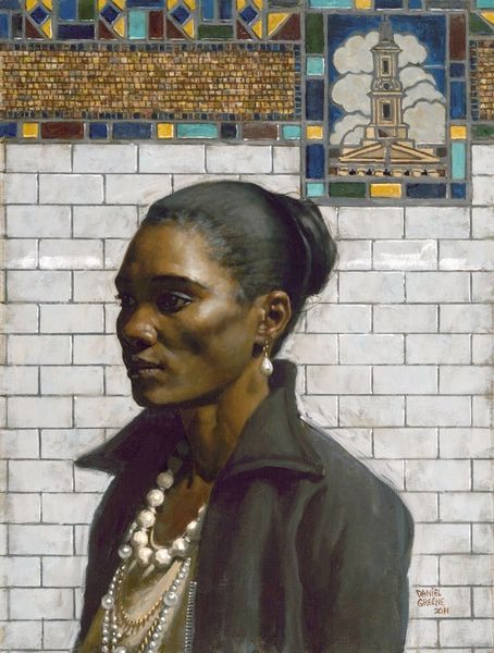 Daniel Greene created '51st Street' with oil on canvas, deploying a high degree of illusionistic skill. The artist's hand is evident in the blending of pigments, carefully modulating light and shadow. Yet, rather than focusing on the artist's virtuosity, consider the subject: an anonymous woman, waiting in a subway station, a thoroughly modern space for the transit of labor, rendered here in painstaking detail. Think about the labor involved in this painting, contrasting the traditional, slow craft of oil painting with the industrial processes that created the subway itself, and indeed the clothes and accessories the woman wears. The mosaic tilework behind her is also labor-intensive, evoking the many hands that built and maintain the city’s infrastructure. In focusing on this everyday scene, Greene bridges the gap between traditional art forms and the realities of contemporary life, challenging us to see the value in both.