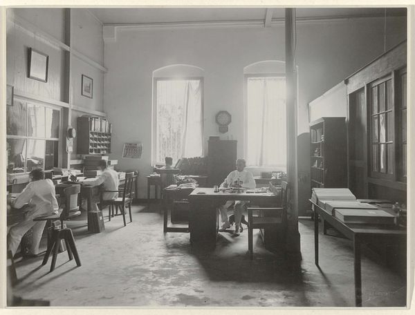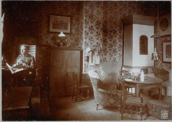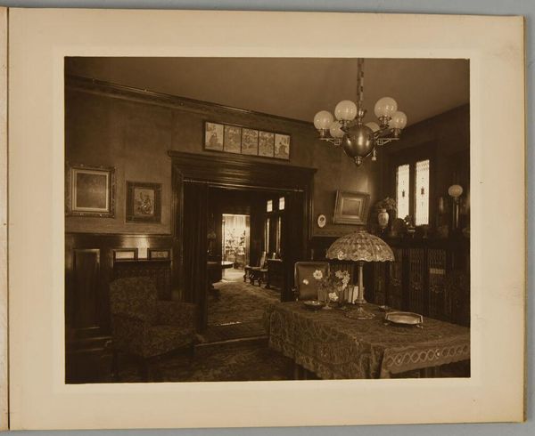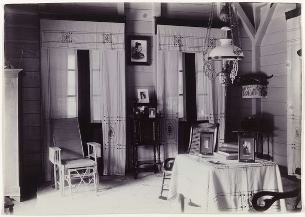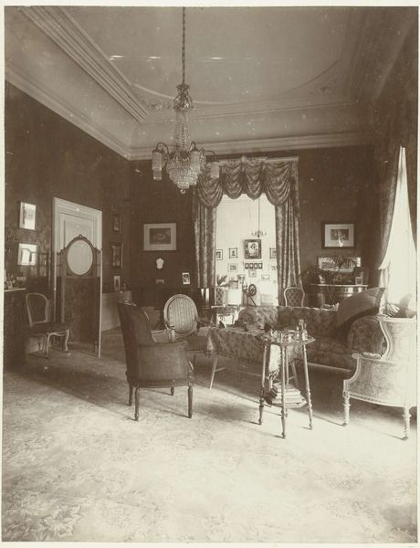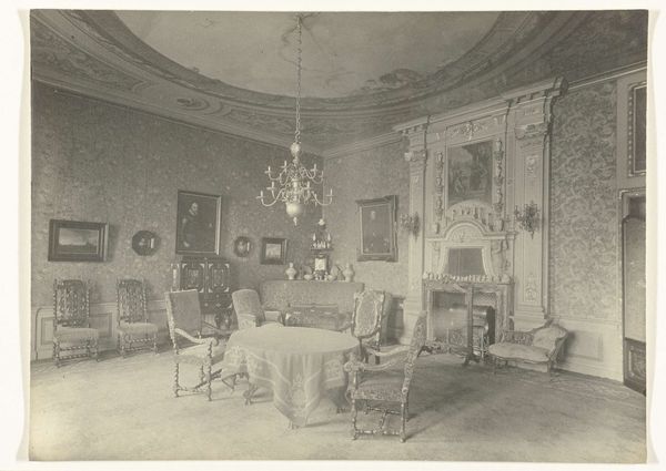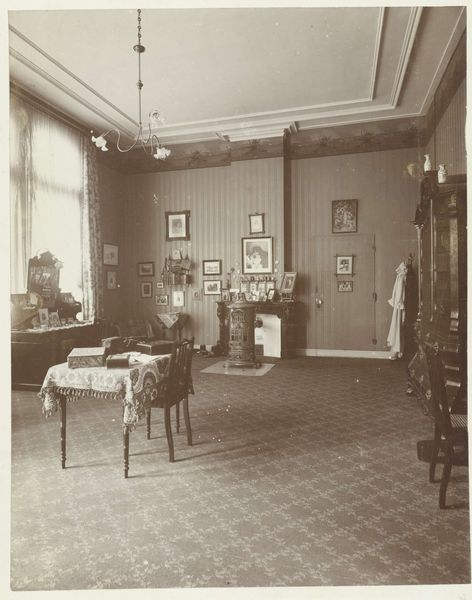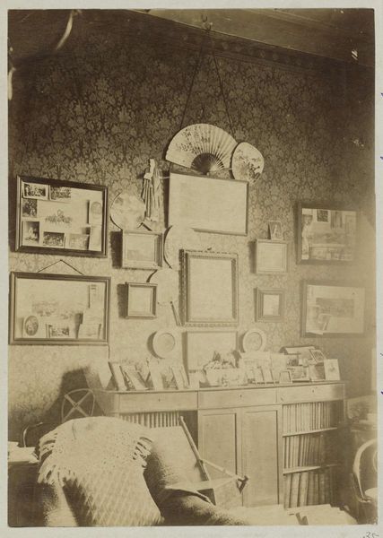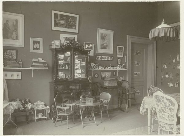 Editor: This photograph, titled "Interieur van De Wildbaan, het woonhuis van de fotograaf in Driebergen," captured sometime between 1903 and 1907 by Henry Pauw van Wieldrecht. It looks like an albumen print, so quite old! It shows the interior of a home just cluttered with, what I'm assuming are family photographs. What do you see in this piece? Curator: Oh, what a fantastic question. Looking at it now, I find myself thinking of Proust, remembering things lost…or perhaps, just preserved obsessively! It’s clearly a deeply personal space. Imagine the stories these walls could tell, each frame a little window into a moment cherished. The lighting, though muted, hints at a serene atmosphere. Does it strike you as cozy, or slightly…claustrophobic? Editor: Hmm, cozy, but the sheer number of pictures feels a bit overwhelming! Curator: Exactly! It’s a dance between intimacy and the verge of, shall we say, a "photo-bomb" of memories! Think about the intent: was it vanity, familial pride, or perhaps the anxiety of time slipping away that prompted this visual avalanche? It begs the question, what do we choose to remember and, perhaps more importantly, *how* do we choose to remember? Editor: It’s like the pre-digital age version of endless scrolling. I guess every generation has a way to cope with that fear of forgetting. Curator: Precisely! A tactile scrapbook expanded into three dimensions! It really makes you think about our modern obsession with digital archiving, doesn't it? We might be preserving more, but are we really *remembering* better? Editor: So, it is not just an old photo of an interior. It is a meditation on memory. I did not realize how powerful that can be just by the arrangement and display. Curator: Precisely. Art whispers when you lean in to listen.