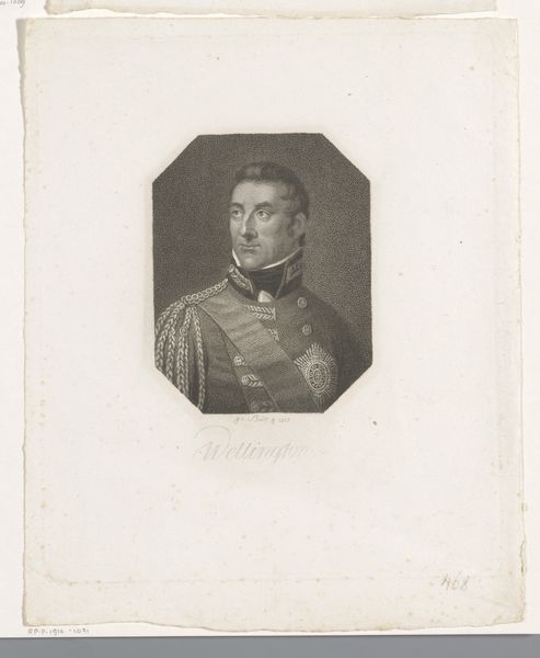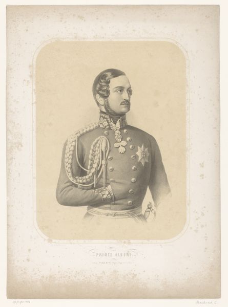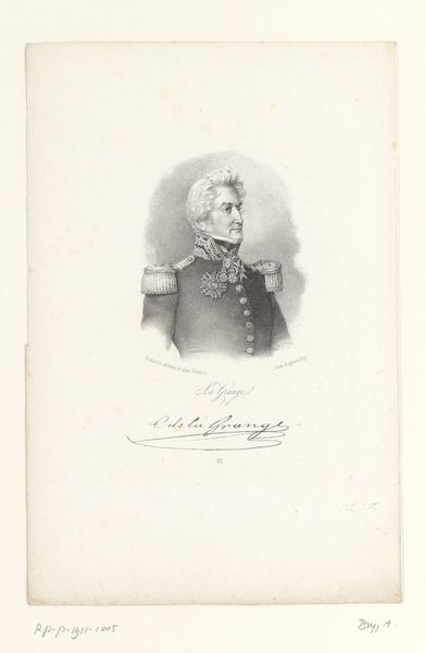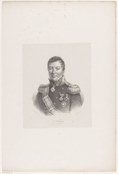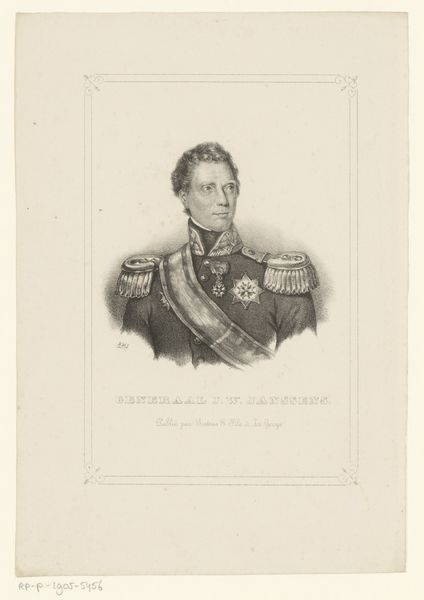 Editor: We’re looking at "Generaladjudant F.B. B\u00fclow," a lithograph print created in 1832 by David Monies. The subject has such a stoic expression. What strikes you most about the composition of this piece? Curator: The strength of this work lies in its skillful manipulation of light and shadow to convey a sense of depth and form. Notice how the artist uses delicate gradations in tone, particularly in the face and uniform, to create a three-dimensional effect on a two-dimensional surface. This lithograph achieves remarkable realism by employing techniques that emulate the precision of engraved lines, despite relying on the unique properties of lithographic stone. Editor: That's a great observation. How would you describe the realism style? Curator: Realism, as evidenced here, aims to depict the subject as accurately as possible. Focus not just on imitation but also on compositional arrangements. Consider, for example, the stark contrast between the subject’s elaborate military dress and relatively plain background. This helps to isolate him. And by examining its stylistic features and method of manufacture, we are given insight into the artistic practices of its time. What do you think about this idea? Editor: I agree. Breaking down the artistic style like that certainly makes me understand it more clearly. This exercise was very illuminating. Curator: I concur. Understanding art hinges on deciphering its intrinsic features; by scrutinizing these features, one may appreciate the complex web of meaning held within this image.