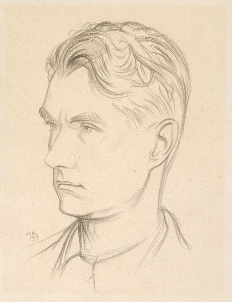 Editor: This is Boris Kustodiev's "Portrait of K.B. Kustodiev," created in 1921 using pencil. There's a serene quality to the portrait; the subject's gaze is distant, contemplative. What's your take? Curator: Serene is a good word. It’s tempting to view this piece as merely a preparatory sketch. But look closer! The nuanced shading around the eyes and lips speaks to me of a tender introspection. Kustodiev, battling illness at this time, perhaps saw himself not just as a figure to be rendered, but as a soul navigating uncharted waters. Don't you think there's a touch of melancholic beauty woven in? Editor: I do see that now! I initially focused on the realistic depiction, the clear influence of Realism and the Russian avant-garde, but I hadn’t considered the emotional layer quite as deeply. It’s like he’s drawing not just a face, but an interior landscape. Curator: Exactly! It makes me wonder about his state of mind; the year it was created. It also shows an honesty you rarely find in official portraiture. It seems less concerned with flattering representation and more about exploring the depths of human feeling. Do you find this exploration to be a unique feature of Russian art at that time, generally speaking? Editor: Definitely, and especially considering Kustodiev’s physical condition during that period, I see more nuance and context behind his process of making art. Now the “unfinished” look resonates differently – it’s part of a deeper search. Curator: Agreed. A simple sketch reveals a soul; isn't it marvelous how art allows us such intimate access? It's as if he has shared a bit of himself, leaving the viewer to finish the story. Editor: It’s like a beautiful question, more than an answer. Curator: Indeed, and questions, darling Editor, are what keep us thinking and creating, even after the pencils are put down!