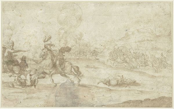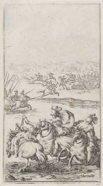 Curator: Looking at this work, I’m immediately struck by a feeling of vulnerability amidst the sweeping landscape. The figures appear so fragile, almost ephemeral. Editor: Indeed. What we're seeing here is a print from between 1620 and 1664, housed at the Rijksmuseum. It depicts the "Journey of Jacob to Egypt," created using etching and engraving, media that allow for intricate detailing but also contribute to that sense of lightness. Curator: Lightness is the perfect word. The etching technique, particularly, creates a quality that enhances the delicate features and makes them look ghostly. How interesting that such an ostensibly triumphal narrative feels so tinged with transience. I'm particularly curious about the politics of migration inherent in the artwork itself. Editor: I agree completely. To me, the artist has captured the weight and precariousness of relocation, this family migration reads differently when placed against global narratives and the intersectionality of diaspora identities. Do you think that the use of animals – the mules, the cattle – speaks to a commodification of their assets? Curator: Certainly, this imagery is steeped in art historical depictions of family narratives and landscapes that are simultaneously familiar and strange. What really stands out for me is how this approach impacts our understanding of labor—human and animal—in service of family survival. And to have this within the "history-painting" genre allows the viewer to question just how much truth is contained in the dominant historical perspective. Editor: It prompts us to remember how history often favors particular narratives while obscuring other voices, like women, the lower classes, or even these traveling animals we see etched so intricately. In fact, they really feel like witnesses of the journey. Their gaze encourages us to reflect on our present situation in light of past struggles. Curator: I couldn’t agree more. Considering contemporary immigration politics, the image sparks powerful associations and helps bridge historical narratives with current events. It’s fascinating how a nearly 400 year-old print can still speak volumes about identity and displacement today. Editor: Well said. Looking at the composition now, I’m left feeling hopeful despite its undercurrent of fragility, I feel a sense of connection.