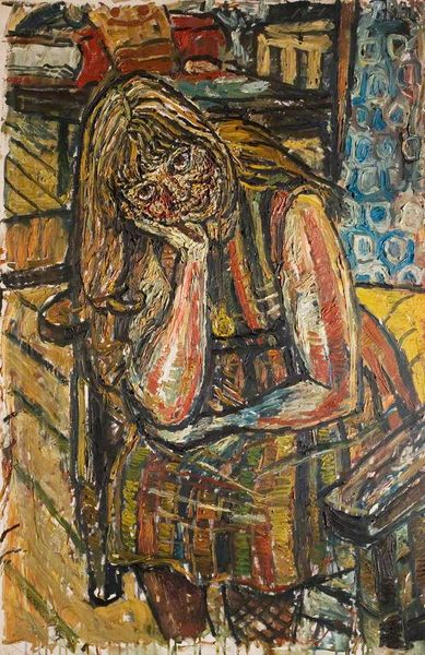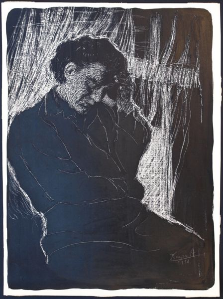 Curator: Welcome. Today, we'll explore Pablo Picasso's painting, "Two Figures," crafted in 1904 using oil paint. It's a piece that quietly commands attention, wouldn't you agree? Editor: Indeed. The figures seem submerged in a deep melancholy, or perhaps, simply profound weariness. The almost monochromatic blue palette really intensifies that feeling of emotional weight. Curator: That dominant use of blue aligns, of course, with Picasso's Blue Period, a time when he frequently depicted themes of poverty, loneliness, and social alienation. The stylistic links with expressionism are clear here, too. What do you think it suggests about the symbolic content? Editor: Well, seeing two figures in such a state immediately brings to mind concepts of shared hardship, or mutual support in difficult times. Note how the slumped posture, the heads leaning against each other—it all hints at empathy, yet also resignation. Is there a narrative implied about Parisian society? Curator: Certainly. This work offers insight into the social fabric of early 20th-century Paris. It reflects a period marked by significant societal shifts, burgeoning urban poverty, and widespread struggles of the working class. The art world had begun, in some ways, to engage with real hardship beyond classical idealism. Editor: Looking closely, you'll notice the impasto technique—the paint is applied so thickly that it creates texture, almost sculptural. It reinforces the tangible reality of the figures' existence. To me, they feel monumental even in their sorrow. Curator: Yes, the way Picasso handles paint conveys the weight of their circumstances, both physically and emotionally. But I can’t ignore that these early works brought Picasso to public attention; and that, ultimately, it's impossible to divorce his "blue period" from the rise of a legend. The politicisation of poverty by artistic communities, or wealthy patrons... Editor: I see what you mean about the inherent complexities of turning social suffering into spectacle or capital... It's powerful how Picasso’s early symbols have grown into something almost legendary—turning something painful into an historical and symbolic landmark. Curator: Absolutely, an unforgettable glimpse into a formative period, and the narratives and politics surrounding his artistic development. Editor: Indeed, a profound testament to enduring human experience.
