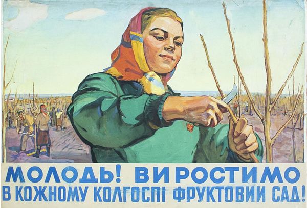Curator: This striking piece is titled "For the Benefit of the People" painted in 1955 by Valerii Lamakh. It's an oil painting, and its monumental scale really grabs your attention, doesn't it? Editor: Absolutely, the sheer size telegraphs ambition. It has a somber tone though; there is a lot of blue and grey in the landscape surrounding the man, it suggests a certain…industrial melancholy, almost. Curator: Interesting. Consider the symbolic weight of the elements: the worker holding what looks like a perfectly formed ingot, set against a backdrop of industry – a newly built dam perhaps, and factories. Editor: I see it. The ingot represents material achievement; however, the way it is positioned, almost as a mirror to the worker's face, is curious. There's a doubling, an offering of his labor and himself to the larger project. Curator: Precisely. Note the composition. The worker's gaze directs us forward, but also slightly upwards. This oblique angle, combined with the vibrant palette choices within the face, seems to lift him into an almost heroic stature. It invokes idealisation. Editor: Yes, a careful balance of individual and collective identity. It's clear in his uniform cap. The symbolic weight of his tool seems softened by the looping curve of the metal handle. Perhaps, softening the harder elements of industry? Curator: Observe the stark realism of the man's face against the almost sketched-in background, creates a dynamic tension within the frame. His gaze seems determined. Yet it also feels heavy, laden. Editor: Agreed. Perhaps he is meant to exemplify the working-class hero, while also signifying the emotional cost. Curator: The artist deliberately used the materials in such a way as to both romanticize, while making a specific visual argument for his strength, but still there is more nuance. Editor: Lamakh's picture really urges one to think about the symbols we imbue with such hope – and also to consider what lies beneath that constructed idealism. Curator: A poignant balance between form and iconic weight. Editor: Indeed, food for thought!