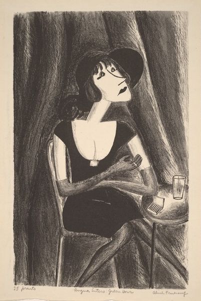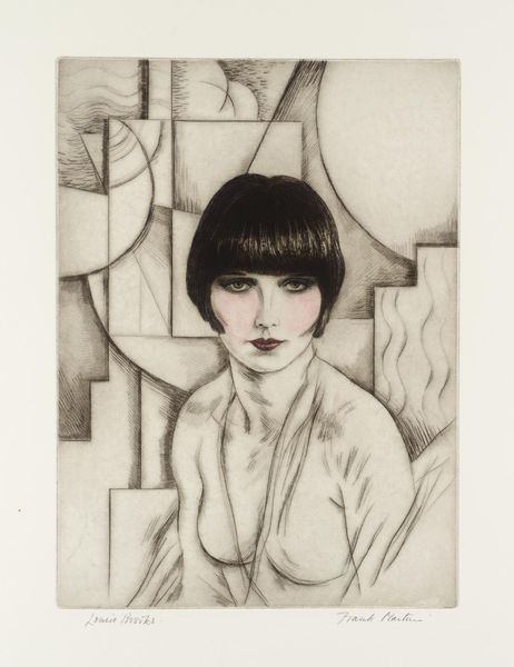 Editor: Here we have "Candy Box Girl," a graphic drawing and print, by Elizabeth de Gebele Ginno, dating from around 1940. The geometric shapes framing the woman’s face give it a somewhat unsettling but intriguing mood. How do you interpret this work? Curator: Intuitively, I'm struck by its curious blend of boldness and vulnerability, as if the artist, Ginno, is whispering a secret through a megaphone! The sharp lines of Art Deco, that flapper-era glamour frozen in monochrome, box her in, yet the flowers soften the blow. Don't they look like someone has put them there as an afterthought, or, worse, to pretty up the box after the Candy Box Girl herself is gone? Editor: That’s a really evocative image, a ghostly confection, that box! What does that say about how women are, or were, portrayed, especially then? Curator: Right, right. Is this artwork challenging the objectification of women at that time or perhaps even complicit with it? Remember, context is key; Modernism was both rebellious and deeply flawed in its attitudes toward women. Is this a celebration of geometric form and feminine allure or a commentary on the constraints placed upon women? Editor: The contrast makes it ambiguous, right? I can almost feel her looking back at the viewer, trapped in this image. Curator: Precisely. Trapped *and* empowered! It's that delicious tension that makes Ginno's work so endlessly fascinating. Editor: I'll never look at an old candy box the same way again, now. I learned that ambiguity doesn’t make art weaker. Curator: It is that very tension, like unsweetened chocolate, that gives art its lasting power, its delicious bite, the flavour we revisit for meaning!
