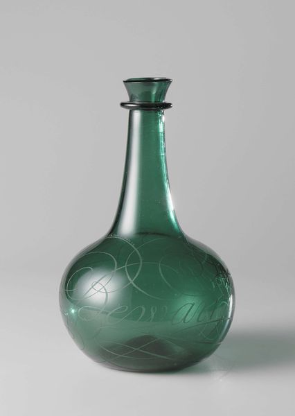 Editor: Here we have a glass bottle from 1683, the inscription reads "Hoogmoed gaat voor den Val", it's made from glass and potentially ceramic, depending on how it was made. I’m really struck by how delicate and ephemeral the glass seems, considering its age. What is your perspective? Curator: It's crucial to look at the material history here. This bottle, its production – how was this glass made, by whom, and under what conditions? The engraving too; this wasn’t mass-produced. Think of the specialized labour involved in creating this single object. This wasn't mere craft; it speaks to early mercantile capitalism. Do you see it that way too? Editor: That's fascinating! I hadn't thought about the production process in such detail. Knowing the glass isn't simply "there" but produced through specialised labor transforms my understanding. It highlights the skilled artistry behind what might seem like a common object. So, you see the inscription "Hoogmoed gaat voor den Val" as less about individual morality, and more about production of it's own value? Curator: Exactly. “Pride precedes the Fall”. Whose pride are we talking about? Not the user of the bottle, I posit. Instead, this text implicates the pride and toil taken by the maker, imbuing the piece with symbolic and economic meaning. It’s labour manifest in material form. Editor: So, it's more than just a decorative bottle. It becomes a vessel containing the history of its making, both physically and socially. It also shows the cultural values around pride that time! Curator: Precisely. Now consider how the meaning might change depending on the viewer, and the purpose for which this bottle would be intended, who would be filling it, and with what? Editor: That gives me a much broader and critical appreciation of this object and I will consider materials and labour of creation as part of the analysis of artworks going forward! Curator: Wonderful! Approaching art through its materiality gives voice to the silent histories embedded within.