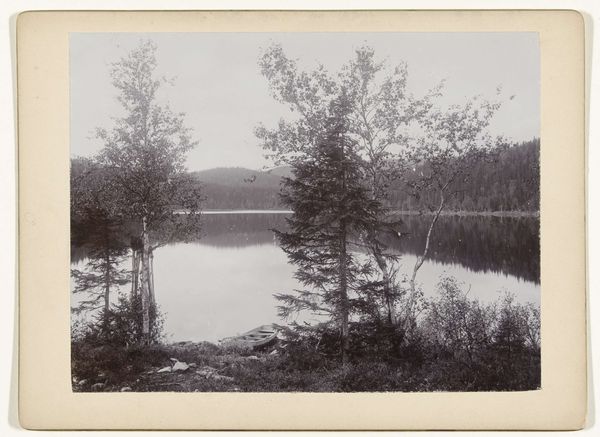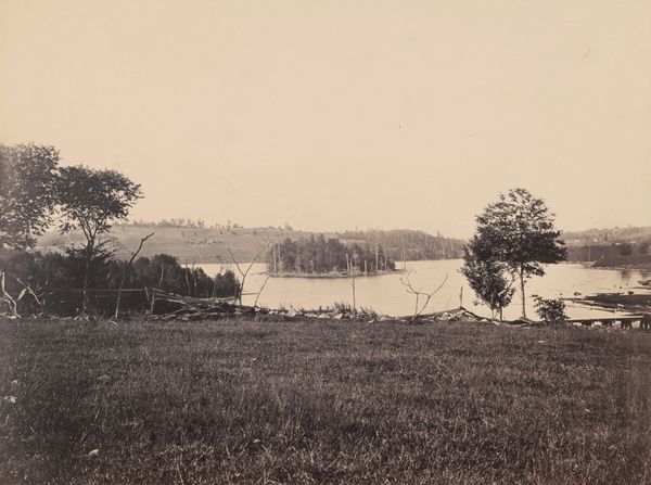 Editor: This is Timothy O'Sullivan's "[View on Appomattox River, Virginia]", a gelatin-silver print from 1864. It's a really stark landscape, quite different from the romantic landscapes of the Hudson River School, which I see is listed as one of its art movements. It feels so… empty. What strikes you when you look at it? Curator: The apparent emptiness speaks volumes, doesn't it? Consider the Appomattox River – a vital artery during the Civil War. The seemingly objective recording of the scene becomes a potent symbol of a nation fractured. What do the skeletal trees in the foreground evoke for you? Editor: Well, they're certainly not lush or vibrant. They feel… barren, like they're reaching out with clawing hands. It's not exactly comforting imagery. Curator: Exactly! These bare trees, stark against the sky, can be seen as visual metaphors for loss and devastation. The river, typically a symbol of life and continuity, reflects a somber, almost ghostly light. O'Sullivan wasn't just documenting a landscape; he was capturing a psychological space, a collective trauma etched onto the land itself. Do you think the choice to exclude figures contributes to this feeling? Editor: Definitely. Without people, it’s like this scene is a stage set after the actors have left, and all that's left is the atmosphere of what happened. Curator: Precisely. The absence becomes a powerful presence, forcing us to confront the human cost of war indirectly, through the altered landscape. This photo almost seems to memorialize the moment history changed forever. Editor: I hadn’t thought about it that way. So, the starkness isn't just aesthetic; it's conveying deeper meanings connected to war and its impact. Curator: Absolutely. The iconography of desolation serves as a silent testament to a turbulent period. Understanding the visual vocabulary helps unlock deeper narratives. Editor: Wow, I’ll definitely be looking at landscape photography differently from now on. Thanks!