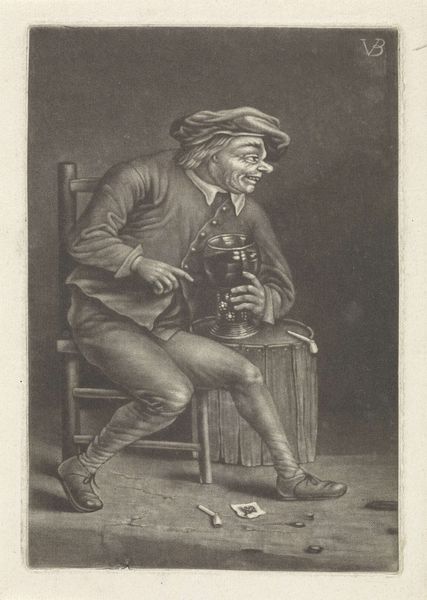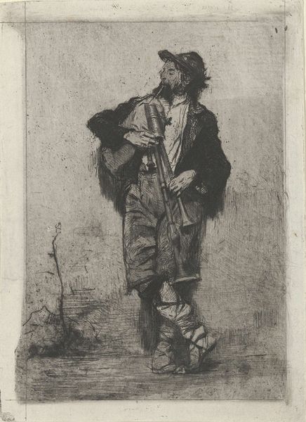 Eberhard Cornelis Rahms made this print, "Standing Boy with Flute," using etching techniques. The image depicts a young man in what seems to be traditional Dutch attire, leaning against a structure, perhaps a fence, with a flute in his hand. Rahms was working in the Netherlands during a time of burgeoning national identity, and genre scenes like this one were popular. This image taps into the nostalgia for rural life and simpler times. It idealizes the common person, aligning with the broader Romantic movement that valued emotion and nature over industrialization and urban life. The flute is not just an instrument, but a symbol of pastoral tranquility. To truly understand this piece, we need to consider its circulation. Was it intended for a broad public, or a more elite audience of art collectors? Research into the Dutch art market of the 19th century, along with the artist's biography, might reveal the social and cultural aspirations embedded in this seemingly simple image.
