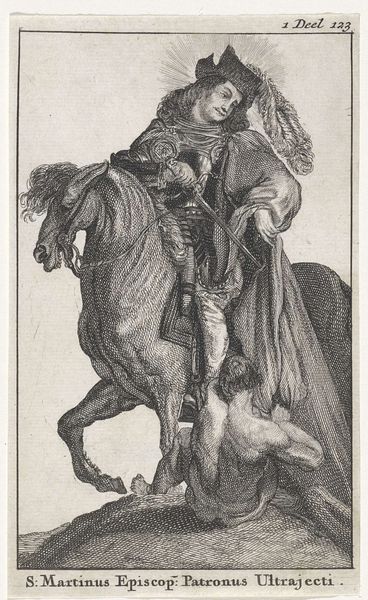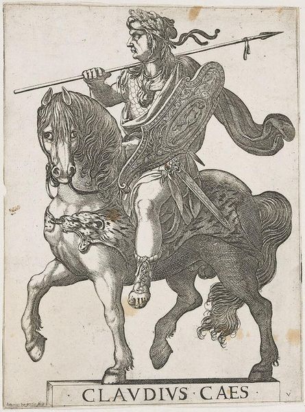 Curator: Laurens Eillarts created this print, entitled “Ruiterportret van keizer Claudius”, sometime between 1616 and 1620. Editor: There’s something incredibly striking about its graphic nature, almost like an incredibly detailed illustration. The sharp lines create a very powerful presence, especially when showcasing such a stoic portrait. Curator: Indeed. Eillarts, clearly schooled in academic traditions, leverages the engraving medium to meticulously define every contour of Claudius, from his laurel wreath to the detailed ornamentation of his horse’s trappings. The formal pose and attire project an image of immutable authority, perfectly capturing the ideals of baroque portraiture. Editor: But there is so much implied labour here, isn't there? Each line of that armour, the texture of the horse's mane... someone sat and meticulously etched all of this. It makes you wonder about the division of labour in his studio. Were there assistants? What kind of tools were used? And how was this print circulated? Was it purely for artistic appreciation or something else entirely? Curator: A sharp point. Focusing on the material process reveals the print's nature as both art object and functional item within a visual culture that utilized reproducibility. Its purpose could have varied, perhaps meant to disseminate an image of power or celebrate antiquity, each intention impacting how its physical components—paper, ink, technique—were valued. Semiotically, the medium affects our reading of Claudius too. Editor: Absolutely. Consider how the print’s dissemination differs from an oil painting hanging in a noble collection. These were designed for a wider circulation that democratized art, transforming viewership itself through new, widespread, media. The textures also carry a unique hand-wrought signature, speaking volumes on Baroque visual economies, even at imperial command. Curator: Your interpretation is truly generative! By seeing this work as an output of specific systems, we highlight a crucial point about its endurance: Its materiality shaped its message then, just as much as it continues to now, and our present analysis becomes intertwined with Eillarts' initial vision. Editor: I'm fascinated about how the historical making of this image and current experience shapes and underscores value and meaning to us today. Thank you.