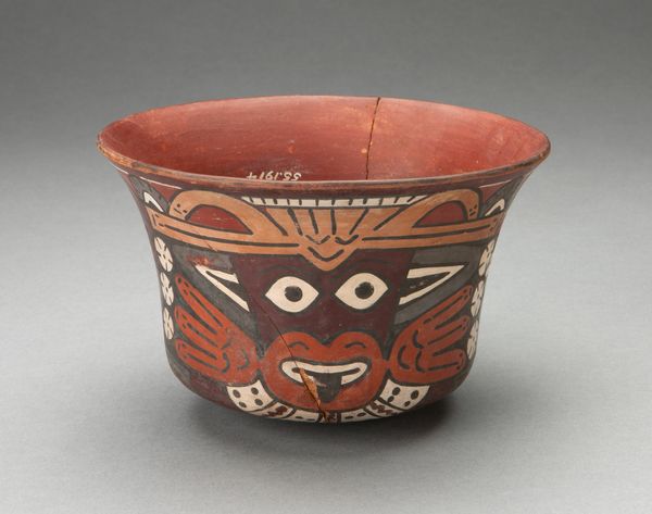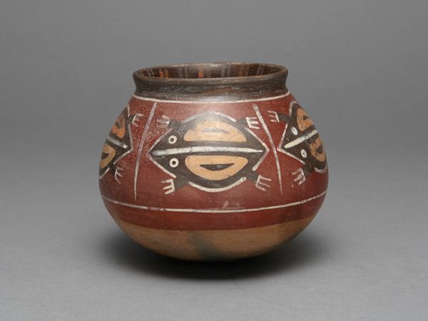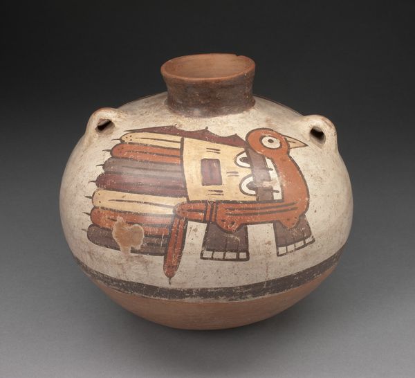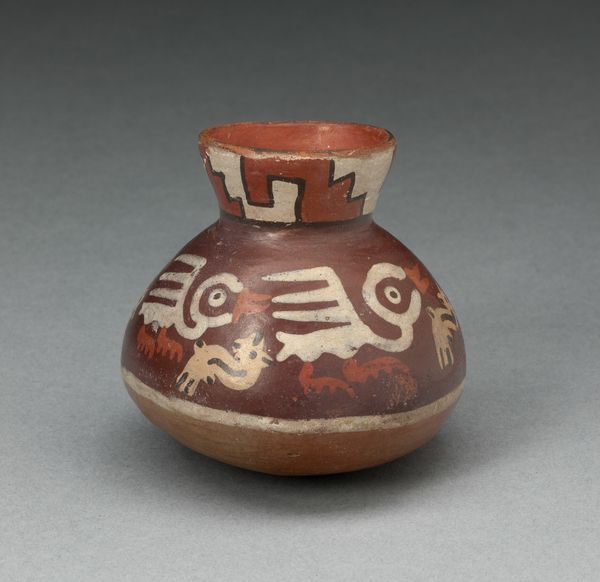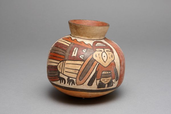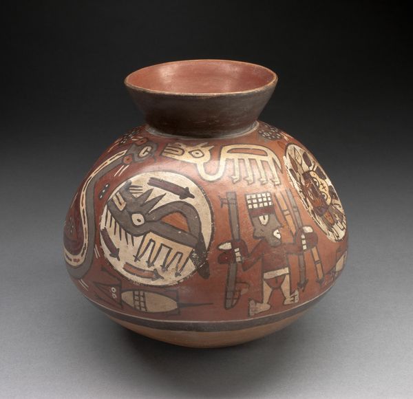 Curator: Well, this unassuming ceramic jar holds a wealth of stories. It’s a Nazca piece, dating from about 180 to 500 AD. It's called "Collared Jar Depicting Costumed Ritual Performer Holding Checkerboard Staff." Editor: My first impression? Earthy. Like digging something profound from the soil itself. And a little menacing with that prominent feline face. It's not exactly comforting. Curator: The depiction is definitely intentional! Nazca pottery wasn't just functional. It served as a potent form of visual communication. Consider the performer here—likely a priest or shaman—in costume. He bears this peculiar checkerboard staff; its significance continues to be a matter of speculation, some suggesting an object of warfare or agriculture. Editor: Yes, warfare… because someone obviously went through so much labor to form and fire this beautiful thing—they were not simply thinking about putting flowers inside! You think of the time, the physical exertion involved in digging clay, processing it, forming the vessel, carefully painting and firing it just so. It’s a sophisticated chain of production. Curator: Exactly. Each of those stages tells us about their skill, resources, beliefs. It makes me think about intention and purpose... What meaning did this object hold in its original context? How did they perceive it? Was this intended as a functional everyday thing, a celebratory object or did they assign some symbolic weight to it. I just feel as though it’s radiating that power! Editor: You are right, the color palette alone! Earth tones – reds, browns, creams. Minerals ground and mixed, fired into permanence. It makes you wonder, did the materials themselves hold some sacred or symbolic power? Curator: Possibly, which adds to this object's mystery and allure. I love that pottery provides a lens through which we view life, rituals, and beliefs so unlike our own. Editor: Precisely! When you think about all the human hours embodied in the final fired pot – it transforms from artifact to document, or even a time capsule that speaks about the maker as well as its wider cultural contexts. It brings you much closer to past lived lives and shared understandings, no?