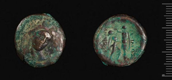 Curator: This coin, "As of C. Terentius Lucanus, Rome", is a glimpse into ancient Roman currency, crafted by the moneyer C. Terentius Lucanus. Editor: It feels like holding a piece of the earth, doesn't it? So worn, so textured, it whispers of countless transactions and hands. Curator: Exactly, each marking tells a story. On one side, you see the conjoined heads of Dioscuri, and on the other, Jupiter driving a quadriga. Editor: The Dioscuri, those twin brothers embodying masculine power, juxtaposed with Jupiter's divine authority...It is a political statement, reflecting power structures and patriarchal foundations. Curator: Possibly. Or a cultural touchstone—a symbol that would resonate with the population, reminding them of their gods, of victory. Editor: Ultimately, it shows us how economic objects can simultaneously operate as tools for political messaging. It makes you wonder, what coin are we carrying today? Curator: That's a compelling question to sit with, isn't it?