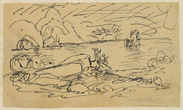 Editor: This is Rodolphe Bresdin's "Landscape with Mountains," a small pen and ink drawing. It's so stark and evocative. What strikes you about it? Curator: Bresdin's landscapes weren't simply observations; they were often charged with symbolic meaning, reflecting his radical politics and critique of societal power structures. Consider the scale – the mountains dwarf any human presence. Editor: So, is the landscape a metaphor? Curator: It could represent the overwhelming forces of nature, or perhaps even the oppressive structures of 19th-century society that Bresdin resisted. How does that reading resonate with you? Editor: That tension between nature and society really comes through now. Thanks for pointing it out! Curator: It invites us to question our place within these broader systems. It's a call to engagement.