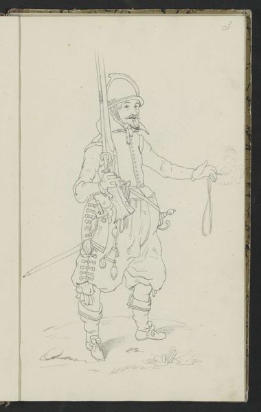 Editor: This is George Chambers' "Dutch Sailor, Carrying an Anchor," created sometime between 1820 and 1830. It's a drawing made with graphite, colored pencil and pencil on paper. It feels quite understated, almost like a quick sketch, yet there's a definite character captured. What do you see in the way the artist has rendered this figure? Curator: The formal elements immediately strike me. Note the stark economy of line; Chambers has managed to convey volume and texture with minimal strokes. Observe how the figure is placed within the frame, neither dominating it nor lost within it, thus creating a spatial tension that is central to the artwork. The choice of colored pencil enhances specific details such as the face, hat and the end of the anchor, drawing our eye to focal points in the narrative structure, almost akin to applying dramatic makeup. Editor: I hadn't really considered the importance of that negative space. Does the flatness of the background emphasize the realism of the figure by contrast? Curator: Indeed. We can appreciate how the contrast between line, colour and surface serves a fundamental purpose. In structuralist terms, Chambers employs these elements almost like linguistic signs that create meaning and allow us to interpret the relation between space and figure. Look, too, at the subtle modelling. How does this formal device serve the composition as a whole? Editor: It guides your eye around the form of the sailor, giving him weight and presence within this minimal space, I guess. I’m starting to appreciate the subtleties of this piece! Curator: Precisely. It’s a testament to how even seemingly simple works can reveal complexity upon deeper structural and semiotic inspection. I’ve come to think about narrative in art quite differently today.
