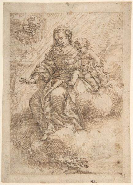 Parmigianino rendered this drawing of the Virgin and Child seated on clouds with pen and brown ink, heightened with white, on gray-brown prepared paper. The Madonna and Child motif carries centuries of cultural memory, with the clouds beneath them signifying divinity and transcendence. This iconography reminds us of earlier depictions of enthroned goddesses from ancient cultures. Consider the visual echoes of Isis nursing Horus, transposed into the Christian narrative. The maternal embrace, the serene expression, the posture - these visual cues create a sense of comfort. But the clouds... In Renaissance art, they become a stage for divine appearances. Think of Jupiter in his cloud chariot, or the Assumption of Mary carried aloft by angels on swirling clouds. This motif reflects a deep, psychological yearning for divine intervention and connection. The cyclical recurrence of these symbols underscores the human quest for meaning, continually reshaped by cultural and historical forces.