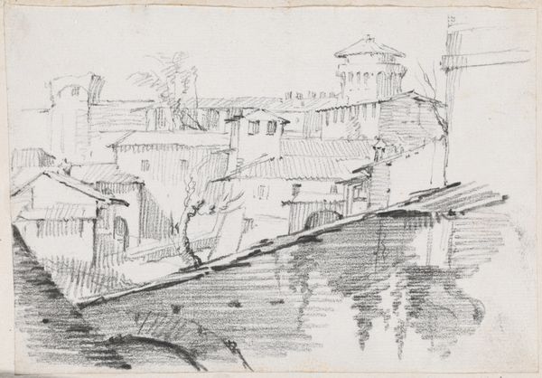 This study of the Ponte Sant'Angelo and houses on the Tiber's east bank was created with graphite on paper by Joseph Marie Vien. Graphite, though seemingly simple, allowed Vien to capture the subtle gradations of light and shadow playing across the Roman architecture and landscape. Notice how he used varied pressure and density of strokes to define the forms. The texture of the paper itself contributes to the sketch's overall effect. The relative softness of graphite is ideal for quick sketching as it effortlessly glides across the fibers of the paper. It would be especially useful for preparatory sketches en plein air because the material is easily portable and the paper can be crumpled into a small ball. Vien's choice of material is significant. Rather than meticulously rendering every detail, he prioritizes capturing the essence of the scene with efficiency. This approach reflects the changing landscape of artistic production at the time, influenced by the rise of industrialism and the need for rapid documentation.