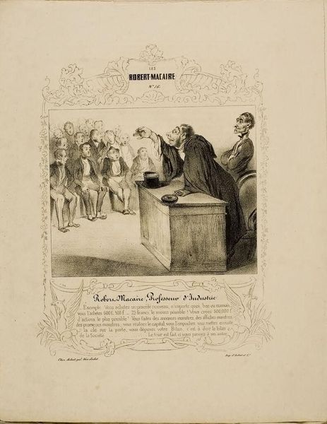 Editor: This is "The Assembly of the Actionaries" by Honoré Daumier. The composition feels very theatrical to me, almost like a stage. What do you see in this piece? Curator: Observe how Daumier employs contrasting lines and forms. The sharp angles of the table juxtapose with the rounded figures, creating a visual tension. Consider how this formal arrangement underscores the satirical nature of the scene. Editor: So, the contrasting shapes are meant to guide our eye and emphasize the message? Curator: Precisely. The composition, therefore, becomes a key element in conveying the work's meaning. Editor: That's a fascinating way to look at it. Thank you!