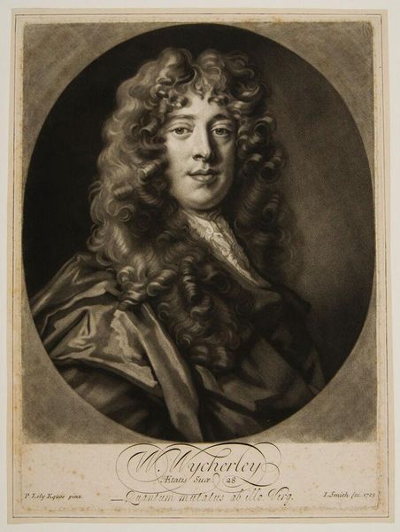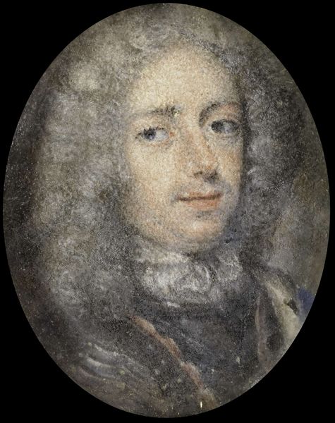Curator: This is Jean-François de Troy's portrait of Jacques-Antoine Arlaud, a rather celebrated miniature painter. What strikes you first about it? Editor: That shimmering cloak, definitely. It looks incredibly heavy, like woven crushed velvet, and the gold embroidery! I imagine it restricted Arlaud's movements quite a bit as he labored over those miniatures. There's something faintly melancholy about this man who spent so much time with these exquisite pieces. Curator: The texture is something, isn't it? And look at how that rich, deep purple offsets the powdered wig and delicate lace. De Troy uses these material signifiers quite cleverly, I think, to position Arlaud socially. The artist isn't just painting a likeness, but crafting a persona deeply intertwined with luxury and artistic refinement. Editor: He certainly exudes an aura of studied elegance, though I detect a shadow of vulnerability in his eyes, as though all that meticulous craft is also something of a burden. Makes you wonder what conditions of artistic production lay behind this presentation. It would be really revealing to trace who wove that cloth, stitched that lace. I'd imagine they had considerably less glamorous lives. Curator: Absolutely. And Arlaud, being a miniature painter, likely understood that tension acutely, participating as he was in both artistic creation and the apparatus of social display and taste. I’m always fascinated by the tools involved, the artisanal knowledge accumulated. The precise detail captured in his miniatures involved countless hours of labour, but often his paintings were collected by those with plenty of time to show them off. Editor: It also leads me to think about portraiture itself – such a status symbol back then, all that effort poured into immortalizing a face and costume. Almost ritualistic, like carefully assembling a tableau of worth. This man becomes both himself and an emblem of artistry. It almost feels like Arlaud has become, or aspires to become, one of his miniatures. Curator: Very well said. It’s a negotiation of power, really—between the subject, the artist, and the audience, all mediated through materials and technique. De Troy is making very knowing use of those cultural markers, those signs of class and education, to create something deeply suggestive, something almost a commentary, even, of what it meant to be a working artist then. Editor: Well, whatever the intent, this image evokes an interesting feeling. Seeing this man and understanding his circumstances makes the work feel very humane. Curator: I concur. A wonderful thing, a portal back in time!