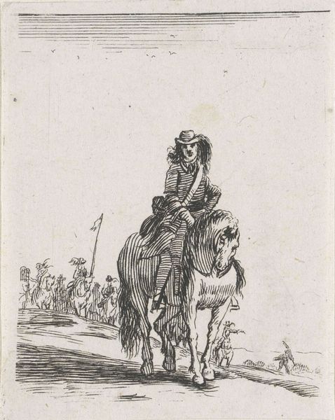 Editor: This is "Man on Horseback," an engraving by John-Lewis Brown, placing its creation somewhere between 1847 and 1890. It’s currently housed in the Met. I'm immediately struck by the rather stark and lonely impression it gives off, mostly in tones of gray. What’s your take on it? Curator: Lonely is an interesting word. I think Brown captures a feeling more akin to stoicism here. There’s something resolute in the angle of the man’s back, the set of his shoulders. It's a romanticized figure but a little different from many equestrian works. This isn't a conquering hero. Do you get a sense of where he might be going, or what he's doing? Editor: I don't know, but I see the weapon, so, my initial guess is that he's a soldier on patrol or en route to a battle. Curator: Yes, perhaps, or simply on a hunt, since those activities often overlapped historically. What intrigues me are the technical choices Brown makes. He is very focused on this idea of creating many fine lines through engraving; this gives us very nuanced light and shadows. Note the landscape – it's suggested with incredibly economical strokes, almost as an afterthought to the figure and his mount. Does it speak to a particular romantic trope for you? Editor: I think so. It reminds me a little bit of the wandering artist trope in Romanticism - alone and in contemplation. That said, I hadn't even considered the technicality of engraving as being a purposeful choice. Curator: Right! And considering the laborious nature of the engraving process makes the swift, sure strokes describing the landscape even more compelling, don’t you think? Editor: I absolutely agree, thank you for helping me notice what could be easily overlooked!