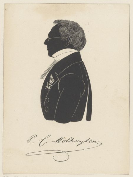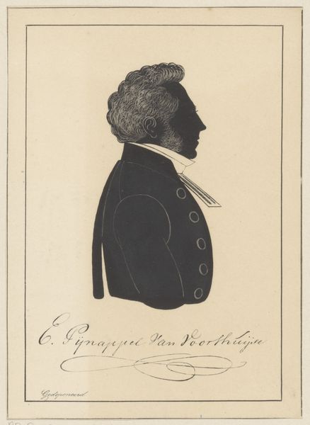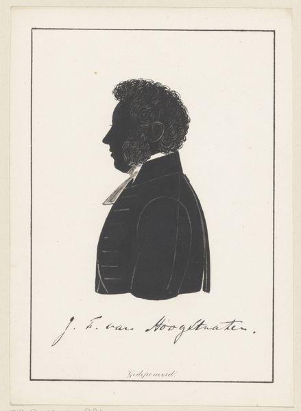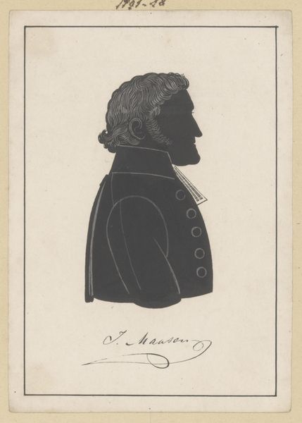 Editor: This is Pieter Barbiers’ silhouette portrait of J. van Rijn van Alkemade, dating from between 1848 and 1862, currently held at the Rijksmuseum. The stark contrast really grabs my attention; it's simple yet conveys so much about the subject's stature. What do you see when you look at it? Curator: Initially, one observes the meticulous application of the silhouette technique. The artist expertly uses positive and negative space to define form. Note how the precision-cut details – the curls of hair, the ornate collar, the buttons on the jacket – these elevate it beyond a mere outline. Editor: It’s amazing that he achieved such detail with a simple silhouette! Is the stark black and white intentional? Curator: The monochrome palette eliminates distraction, directing focus to line, shape, and form. Observe how the artist manipulates the viewer's eye through contrasts of dark and light, highlighting the man's strong profile and creating an image that is at once both forceful and restrained. We are asked to focus on the intrinsic forms, and in turn what they communicate. Editor: So the medium itself becomes part of the message? I hadn’t thought of that. Curator: Precisely. The limitation becomes the artwork’s strength. Does analyzing the aesthetic elements shift your initial perception of the artwork? Editor: Absolutely! I’m seeing it now as more of a technical accomplishment. The limitations really underscore Barbiers’ skill. Curator: Indeed. By examining the formal elements, one gains insight into the artist's decisions, creative process, and the image's aesthetic impact.