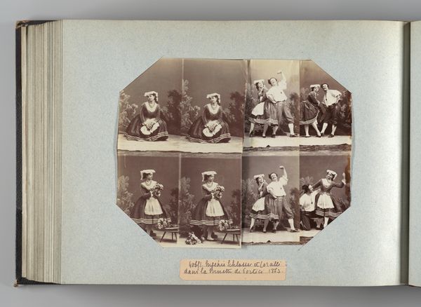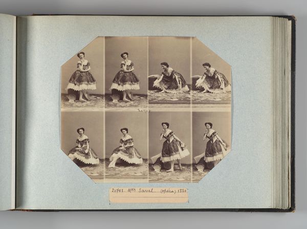 Curator: The photograph we’re viewing, titled "Mlle Rousseau," was created by André-Adolphe-Eugène Disdéri around 1863. It’s an albumen print mounted on card, currently held at the Metropolitan Museum of Art. Editor: It strikes me as a curious, almost staged, set of portraits. The subject is presented in eight different poses, giving us a multi-faceted view, but it all feels rather controlled and formal. What do we know about the sitter, Mlle Rousseau, and the circumstances surrounding this portrait session? Curator: Unfortunately, details about Mlle Rousseau herself are scarce. Disdéri, however, was a very prominent photographer, known for popularizing the carte de visite format. These smaller, easily reproduced portraits became hugely popular, contributing to a boom in portrait photography’s availability and consumption. The material object and the process itself facilitated the rise of photographic portraiture. Editor: Exactly! Consider the social context: mid-19th century, the rise of the bourgeoisie, and their desire for representation and documentation. This is about making images affordable, widely available, and part of everyday life, moving photographic portraiture away from elite circles. And with the carte de visite album format, one could amass an entire social network in one's home! Curator: The poses certainly lend themselves to this democratization of image. I am quite interested in what this studio environment represents – the backdrop and posing reveal this incursion of Romantic ideas into photography. Genre paintings used familiar visual cues; photography now can easily borrow from this tradition. Editor: True. This connects to the power of imagery and representation within social structures. To view oneself through the lens of contemporary ideals, and to distribute it through the commercial networks—a remarkable development for self-perception! Even the details matter, from dress style to her carefully chosen poses. What do those contribute to how society perceived identity? Curator: In the process, photography changed both our expectations for capturing and creating memories, offering a lasting archive of material conditions for later studies. Editor: Indeed. Disdéri's entrepreneurial approach really capitalized on those societal needs. Mlle Rousseau’s photo becomes much more significant in understanding not only the fashions and mores but in seeing this transition. Curator: Agreed. Analyzing photographs such as these enriches our understanding of photography’s role in societal evolution, especially its connection to representation and production techniques. Editor: Ultimately, that's how it shapes culture. So much is caught in one small image.