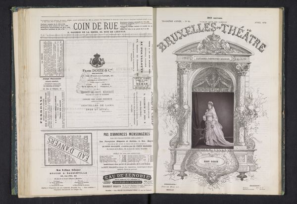 Editor: Here we have a mixed media print entitled "Portret van monsieur Chapuis," attributed to Albert Delabarre from before 1875. It's printed on paper, and from the image it looks like it might incorporate photography. The stark contrast makes me think of early newsprint. What strikes you about this piece? Curator: The combination of media is key here. We see photography, printmaking, and what looks like graphic design all existing on the same page. This wasn’t high art striving for the illusion of reality, but a utilitarian combination. It brings attention to the modes of reproduction at the time, and to who had access to those modes. Think about the materiality of this piece - the ink, the paper, the printing press itself – who owned them? What was the social context? Editor: So you're saying it is not only about the portrait but also about how easily reproducible the portrait is and who gets the portrait? Curator: Exactly. The materiality itself makes it something that's accessible. Notice it's presented within a Brussels theater advert – Chapuis likely paid for the image's placement. That brings up the relationship between art, labor, and commerce. The “realism” tag is interesting; the photo gives the veneer of it but is really another form of labor commodified. Editor: That's fascinating. I didn't initially think about the cost of creating an image like that, and how it speaks to notions of class and the labor involved in image production at the time. Curator: Consider that mixed-media allowed for mass production, influencing access and affordability. Was realism the aim or commerce? What’s the social currency of a portrait, reproduced in this manner, in the 1870s? That brings it alive, doesn’t it? Editor: Definitely! Thanks for broadening my perspective. Now I’m seeing the portrait as embedded in economic and material systems that dictated its form.