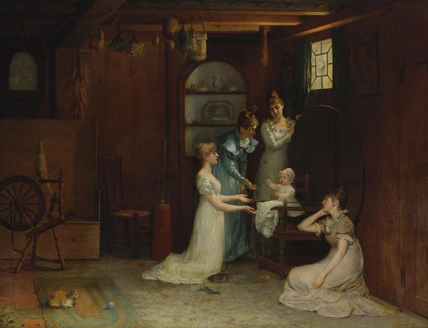 Ferdinand Georg Waldmüller painted Charity using oil on canvas; it presents a scene composed with a clear division between light and shadow, revealing the artist's approach to realism and sentimentality. The girls' positioning is carefully structured: their bare feet on the ground connect them intimately to the earth, while the vertical lines of their figures lead the eye upwards towards the imposing architecture in the background. The composition utilizes a contrast between soft, rounded forms and sharp, angular shapes. The architectural elements loom, suggesting a rigid social structure against which the children's act of kindness stands out. Consider the semiotic implications: the bucket is not merely a vessel but a symbol of resource and communal sharing. The contrast between the children's openness and the buildings' austerity hints at a critique of societal values. The painting's formal elements thus function to communicate ideas about compassion, community, and critique of social norms.
