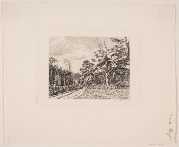 Editor: Here we have "Gezicht op Parc St. Cloud" created by Alfred Taiée in 1875. It's an etching, and my first thought is how the artist captures depth. The path seems to stretch endlessly. What do you see in this piece, considering the formal elements? Curator: Indeed, the artist masterfully utilizes linear perspective to achieve that sense of receding space. Observe how the lines converge towards the vanishing point, guiding the viewer's eye into the composition. Note also the careful modulation of light and shadow, creating depth through tonal contrast, and how the parallel lines create texture in the greenery. It appears rather geometric to me. What do you think about the line work? Editor: I see what you mean, especially how the etched lines are darker closer to the foreground to provide depth. Would the line variation signify that there may be different iterations in the artwork since this is an etching? Curator: Precisely. Consider that each plate and its impression creates a potentially unique state. However, observe beyond mere representation; consider the semiotics of space implied by the strong axis drawn with precision of line, its mirroring created by the tree placement on either side of this road. Do we read the visual language? Editor: So you are pointing out the interplay between lines, texture and form and the structured symmetry to suggest more than just landscape, a formal dialogue. What do you make of its realistic and impressionistic styles, then? Curator: A worthy consideration. This duality reflects the period's artistic transitions, doesn't it? Although classified with each artistic tendency, one must look closely at the materiality and lines which define its intrinsic qualities; it is in the dialogue that the landscape’s essence speaks. Editor: Thank you, that really changes how I look at the piece; shifting away from what's simply depicted to the art of depiction itself. Curator: The focus on formal elements enhances one's art appreciation.