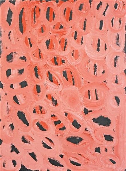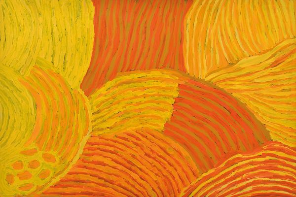 Editor: Here we have Makinti Napanangka's painting, "Hairstring Skirts," made with acrylic paint. The composition, with its linear segments and circular clusters, is quite striking. What is your interpretation of the work's visual organization? Curator: Formally, the painting operates through a system of contrasting elements. Note the interplay between the verticality of the painted lines and the horizontality suggested by the ovoid shapes. Furthermore, the artist juxtaposes warm and cool tones. Could you elaborate on your observations regarding the application of paint? Editor: Well, the texture seems pretty smooth, especially considering it's acrylic, and the layering is pretty uniform. The repetition of brushstrokes adds a kind of rhythm. What do you see in that rhythm? Curator: I am drawn to the concept of visual syntax. The repeated lines may function as a type of visual alphabet. Observe how the color variations contribute to a sense of depth and movement. This movement enlivens the picture plane. Editor: I hadn't considered it as a type of language before, but the more I look at it, the more it makes sense! All those visual contrasts and repetitions work almost like words and phrases. Curator: Indeed. By considering the interplay of form and structure, we appreciate the work's complexity beyond any surface-level assessment. It emphasizes an intellectual framework to approach the art object. Editor: Thanks for your explanation. I see a lot of new aspects now, from how lines interact with space to create different senses of rhythm to building visual form and content. Curator: The synthesis of visual elements becomes more pronounced through close, deliberate looking.