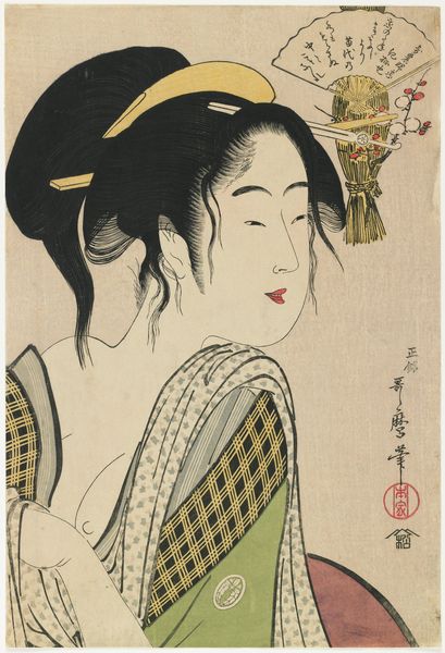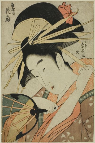 Editor: We're looking at "Prostitute Konosumi" by Kitagawa Utamaro, a print made around 1793-1794. It has a serene, almost melancholic feel to it. The lines are so delicate, especially in the woman’s hair ornaments, and her gaze is quite captivating. What strikes you most about this work? Curator: It’s intriguing to consider this ukiyo-e print in terms of production. Think of the woodblock carving required, the labour involved in creating multiple impressions. It moves beyond a simple portrait. The fan she holds depicting a landscape hints at trade and maritime networks fueling the economy in which courtesans like Konosumi occupied a specific, though often exploited, role. Were these images then simply pretty pictures, or active components within a much larger, commodity-driven world? Editor: That’s a perspective I hadn’t considered! So, you’re saying the material reality of its creation and the social context of its consumption are key to understanding its meaning? Curator: Precisely. And the choice of materials matters, too. Ink on paper – relatively inexpensive, allowing for wider distribution, impacting popularity, image, and desire. Consider how the print as a physical object intersects with class, commerce, and the construction of female identity. What do you make of that interplay? Editor: It’s like the print itself becomes a commodity representing the person. A copy of a copy. Fascinating. This reframes the artwork entirely. I originally perceived her to be pensive but maybe that emotion was being used to promote a consumable idea of beauty. Thank you! Curator: Exactly. Seeing art through its material conditions reveals so much more than just aesthetics. There is always more to learn about these subjects, particularly what role art may have had in this woman’s exploitation, or celebration.