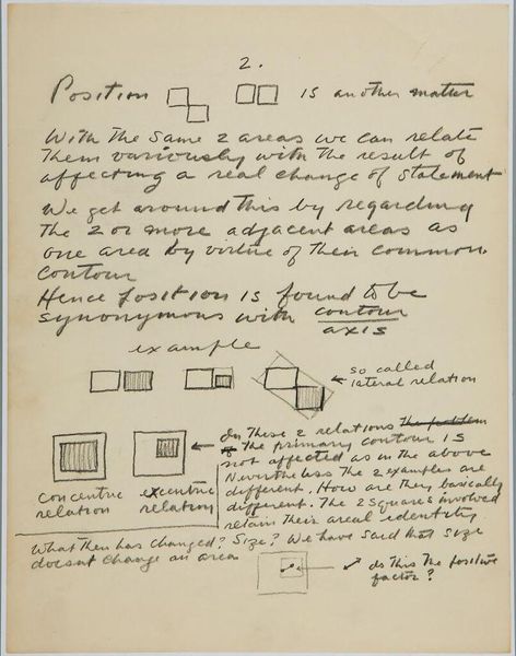 Curator: Here we have Stuart Davis's "Art Theory Text with Diagrams" from around the mid-20th century. It's ink on paper, fairly small, about 11 by 8 inches. Editor: My first impression is that it feels like a playful, almost whimsical attempt to dissect artistic elements. The handwritten text alongside those simple diagrams gives it a very personal feel. Curator: Absolutely. Davis was deeply invested in abstracting the visual world. We see him breaking down concepts like "contour" and "direction" into their basic components, questioning their inherent primacy in art. Editor: And look at how he elevates "direction" to the "prime creator of space." That's a potent visual metaphor. It reminds me of the psychological weight we give certain compositional arrangements. It shows how something as simple as a line can imply so much more. Curator: The materiality of the piece is also key. The use of ink, the paper itself—these are the direct tools of artistic thought. It's like witnessing Davis's mind at work, grappling with the fundamentals of his craft. Editor: It’s fascinating how he’s trying to distill complex ideas into these basic symbolic forms. It makes you wonder about the symbols we impose on art and how they shape our understanding. Curator: Indeed, it reveals Davis's intense engagement with the foundations of his art. Editor: It's a testament to how much can be conveyed through even the simplest marks.