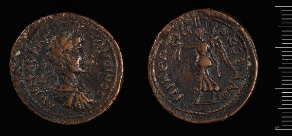 Editor: Here we have a bronze coin of Gratian from Siscia. It's quite small, but the details are fascinating. I’m curious about the figures depicted on it. What do you see in this piece? Curator: For me, it whispers of power and faith intertwined. I imagine the coining itself, the impact of the die, meant to spread the ruler's image and, crucially, a message of divinely sanctioned authority. The figure kneeling before the emperor… Editor: …is that a supplicant? Curator: Perhaps! Or maybe Roma herself, offering allegiance. Think of the symbolism! It's like a tiny, portable propaganda piece, a pocket-sized power statement. What resonates most with you? Editor: I hadn't thought of it as propaganda before, but now I see it! Curator: Exactly! A little window into a world of emperors and gods.