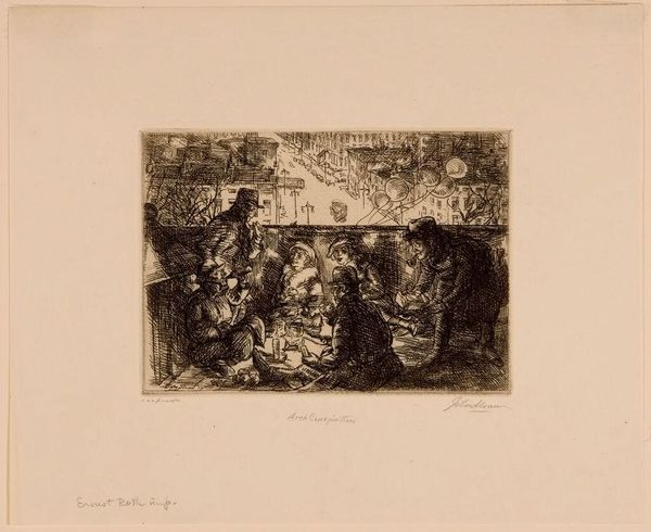 Editor: Here we have John Sloan's "Hell Hole," an etching teeming with figures. There's a palpable sense of boisterous energy, almost claustrophobic. What do you make of this scene? Curator: It's a slice of early 20th-century social life, a gritty realism. Sloan, with his Ashcan aesthetic, wasn't afraid to depict the everyday, the unvarnished. The density, the overlapping figures... it's like a visual cacophony, isn't it? Editor: It is! I see both chaos and a certain camaraderie. Curator: Exactly! Did Sloan idealize it? Perhaps not. But he captured a vital, raw humanity. It’s a world away from the polite society portraits of the time, isn't it? Editor: Definitely food for thought.