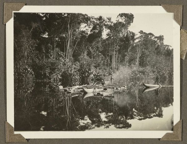 Editor: This gelatin silver print, “Gezicht op een rivier met uitspanning te Laut Tador op Sumatra” by Carl J. Kleingrothe, likely taken before 1898, really transports you. The scene is so still, so dreamlike. What stands out to you when you look at this photograph? Curator: I see a carefully constructed image, one layered with symbols of colonial engagement and the exotic "other." Consider the way the landscape is framed, like a stage. The seemingly untouched nature is juxtaposed with the small structure on the island, and the tiny figure on the water. Doesn't this present a particular narrative about civilization and the wild? Editor: Yes, that juxtaposition is striking! I hadn’t really considered it in terms of a colonial narrative, but now that you mention it, the tiny figure in the boat seems almost overwhelmed by the landscape. The vastness is emphasized. Curator: Exactly. What do we associate with photographic images from this time period? Often it is about documenting and, by extension, controlling a territory and its peoples through representation. Think of the visual shorthand at play here. How does this image speak to the idea of 'discovery'? Is it glorifying a land, or laying claim? Editor: It's fascinating how a seemingly simple landscape photograph can hold such complex ideas about power and representation. The orientalist style definitely adds another layer to that, especially considering when it was taken. It's less a window, and more of a carefully constructed narrative. Curator: Indeed. Reflect on how this image serves not just as a visual record, but as an enduring symbol of cultural encounter. Editor: I’ll definitely be thinking differently about landscapes from now on. It really underlines the importance of considering context and the loaded symbols within what might appear to be a simple nature shot.
