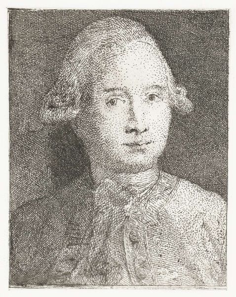 This is a self-portrait by Jabes Heenck, created using etching techniques. The composition is strikingly simple: a close-up of the artist's face and upper body against a shadowy background. The muted tones and delicate lines evoke a sense of introspection. Heenck masterfully uses light and shadow to model his features. Notice how the subtle gradations of tone define the contours of his face, creating a sense of depth and volume. The background, rendered with dense, cross-hatched lines, throws the face into sharp relief. The artist's gaze is direct, but there is a sense of melancholy. Consider how the artist utilizes the linear quality of the etching technique itself. The network of fine lines constructs not just the image but also a mood. These etched lines aren't merely descriptive; they actively shape our perception and invite us to delve deeper into the psychological space of the portrait.