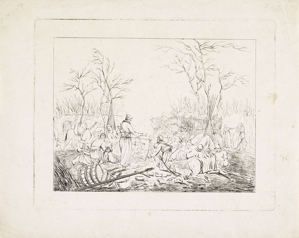 Editor: We’re looking at "Bacchus in zijn wagen," or "Bacchus in his chariot," an etching made by Franz Ertinger between 1652 and 1707. It’s a flurry of figures and lines, chaotic almost, but with a distinct energy. What's your take? Curator: Chaos can be incredibly revealing, can't it? I see this piece as an allegory for the uninhibited expression and the transgression of societal norms, that’s at the heart of Bacchic festivals. Note the state of revelry the figures are in - what norms do you think are being defied here? Editor: Well, everyone is nude, for starters. There's definitely a sense of abandon in their poses. Is it simply about letting loose? Curator: It is that, but also perhaps a reclaiming of the body, right? Think about the context in which this piece was made; a time of rigid social hierarchies. Representing nakedness can be a way to undermine those structures and express primal liberation. How do you think the medium itself, printmaking, contributes to this message? Editor: Because prints allow for wider circulation and make the artwork more accessible to the masses? Curator: Exactly! Print becomes a democratizing tool, challenging elitist notions of art consumption. Consider the figures in the background versus Bacchus in the foreground. Do you think there is any intersectional critique occurring here? Editor: Hmm, Bacchus appears to be the focal point; so he holds the power in the composition. But there is also strength to be found in a group… Curator: Precisely, each group can symbolize or reject the current social constructs based on your experience. This piece encourages us to acknowledge that transgressing norms and celebrating difference becomes vital for the health and progress of a society. Editor: This piece certainly has more to say than just "party time!" Thanks for sharing that perspective. Curator: Likewise. Art is always political when we acknowledge whose voices get amplified, and whose are silenced.