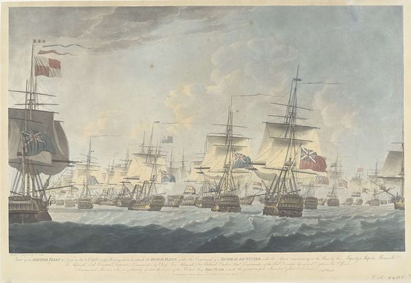 Pierre Charles Canot created this engraving in 1758, depicting a naval battle with remarkable detail. The composition is dominated by the dynamism of the ships, the billowing sails, and the dramatic puffs of smoke from the cannons. The monochromatic palette enhances the starkness and intensity of the conflict. Here, Canot is not merely illustrating an event; he's constructing a visual narrative steeped in the semiotics of power and conflict. The ships, meticulously rendered, stand as signs of national strength and technological prowess. The formal arrangement—the careful placement of each vessel and the lines of engagement—creates a structured representation of naval warfare. The light and shadow define not only the forms but also the drama, accentuating the chaos of battle. Ultimately, this engraving functions as more than a historical record; it's a carefully constructed representation of naval power, with each formal element contributing to a larger discourse on maritime dominance.
