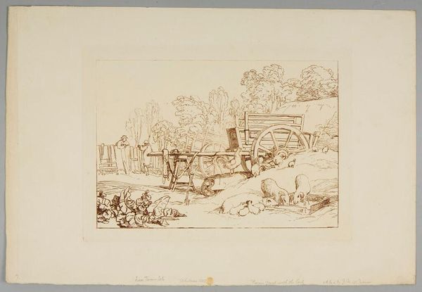 Curator: This is "Ploughing, Eton" by Joseph Mallord William Turner. Editor: It's stark, almost skeletal. The sketch-like quality gives it a raw, immediate feel. Curator: Turner made this etching during his time at Eton College. It depicts agricultural labor on the grounds, with the college buildings faintly visible in the background. It shows the reality behind the institution. Editor: I'm drawn to the lines themselves. The immediacy of the etching process really highlights the physical effort involved in ploughing. It’s not just about aesthetics; it’s about the labor. Curator: Absolutely. Turner, born in 1775, was deeply aware of the societal shifts happening during his time, and this piece definitely reflects those realities in the shadows of prestige. Editor: It makes you think about what that land yielded, and who benefited from the work depicted here. A simple image holds so much about labor. Curator: Indeed, and seeing it in the Harvard Art Museums brings another layer to its story. Editor: It’s incredible how a work of art can reveal layers of production and history with just a few lines.