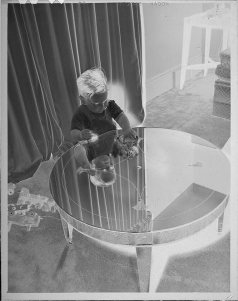 Curator: This photograph, created by Lucian and Mary Brown, is titled "Untitled (little girl and bassinet)." The print measures roughly 5 by 4 inches. It strikes me as remarkably intimate. Editor: Intimate, and a bit unsettling. The high contrast and odd vantage point create a strange tension. One wonders about the child's relationship to the unseen occupant of the bassinet. Curator: The formal elements guide that tension, wouldn't you agree? The wickerwork of the bassinet, the floral wallpaper—their patterns contrast sharply with the child's simple, plaid overalls. Editor: Indeed. The Browns seem to be highlighting childhood innocence against a domestic backdrop, perhaps commenting on the social expectations placed on young women even then. The bassinet, after all, suggests a predetermined future. Curator: I see your point, but the beauty of its composition draws my eye more. Editor: It's a compelling snapshot, however one chooses to view it.