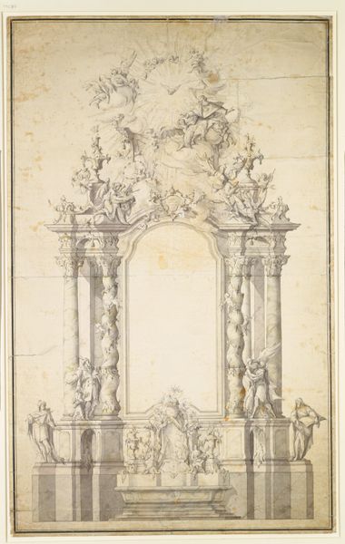 Editor: Here we have Federico Zuccaro's "Design for a 'Quarantore' Decoration," dating from 1540 to 1609. It’s rendered in ink on paper. I'm struck by the intricate detailing – almost like an architectural blueprint infused with a heavenly vision. What's your take on this design? Curator: What interests me is the intersection of the sacred and the material within the design. Zuccaro uses readily available materials like ink and paper to depict an opulent scene, presumably destined to be constructed using far more costly materials. Consider the labor involved in quarrying marble, gilding surfaces. Does this drawing ennoble or critique such lavish displays of religious power? Editor: That's a fascinating point. The drawing itself feels quite humble, a means to an end rather than the final spectacle. Were "Quarantore" decorations typically such grand affairs, demanding intense material investment? Curator: Yes, the Quarantore tradition—forty hours of continuous prayer before the Blessed Sacrament—often involved elaborate displays intended to inspire awe. Reflect on the accessibility of these spaces and decorations. Who could afford to commission such work, and whose labor was exploited in its creation? Editor: So, this seemingly devotional image also raises questions about wealth, labor, and the societal structures that supported these practices during the Renaissance. I hadn’t considered that at first. Curator: Exactly. It highlights how art is inextricably linked to the socioeconomic conditions of its creation, prompting us to consider the ethical dimensions embedded in the materiality of even the most spiritually-inclined artworks. It gives one much to think about. Editor: Definitely, I’ll be pondering the social costs behind that heavenly vision. Thank you.