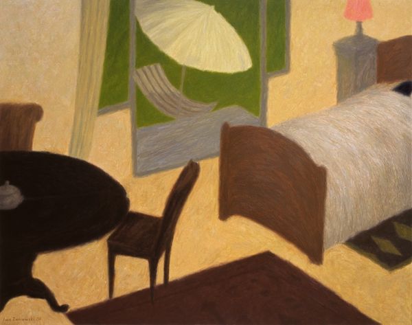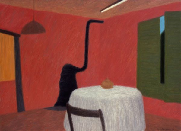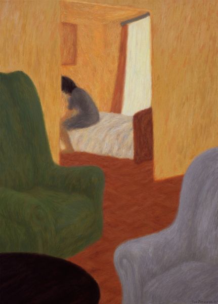 Iwo Zaniewski's "Flat" presents a domestic space, a collection of rooms inhabited by vivid colors and suggestive forms. Light, whether natural or artificial, dominates the image: a potent symbol that has illuminated countless artworks across millennia. Consider the symbolism of light in Caravaggio's religious paintings, where it's used to denote divine intervention, or in the Dutch Masters’ still lifes, where it illuminates everyday objects with profound significance. Here, the light is more mundane, yet it evokes the same human fascination with illumination. The contrast between light and shadow creates depth, but it also speaks to the hidden, the unseen aspects of our lives. The rooms, seen in partial view, also invite a psychological interpretation; are they spaces of comfort, contemplation, or confinement? Such symbols are not fixed. They transform, taking on new meanings as they journey through time, adapting to cultural shifts and the collective subconscious. Light, in this flat, reminds us that even in the most ordinary settings, the human psyche seeks meaning, projecting its fears, hopes, and dreams onto the surrounding world.