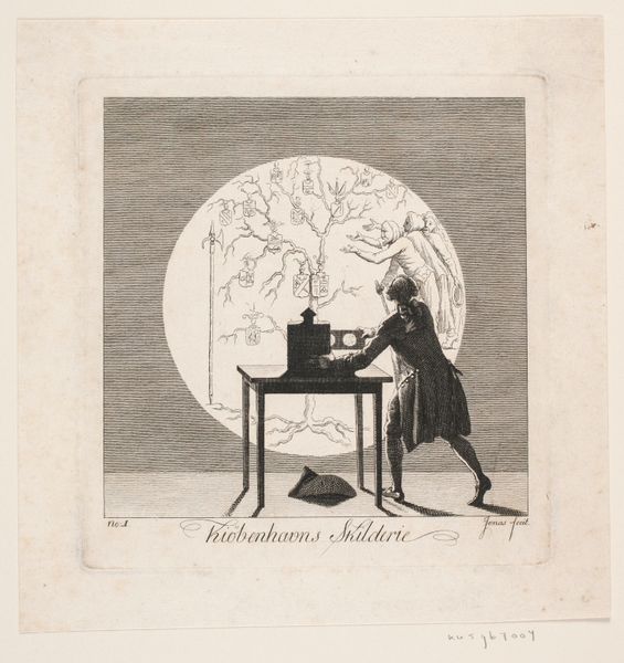 Editor: This print, titled "Kiøbenhavns Skilderie" No. 3 by J.F. Clemens, created sometime between 1785 and 1788, is just fascinating! The composition, the light, feels staged, yet incredibly dynamic with figures scattered and the foregrounded man, appearing to be observing a construction on the table, what do you see in this piece from a formalist perspective? Curator: Indeed. Notice how Clemens utilizes line – predominantly thin, precise etchings – to define form and texture. The tonal range is narrow, resulting in an overall lightness. The eye is led primarily from the foreground figure, then to the activities on the staircase and is then subtly confined within the oval framing device that surrounds the scene itself. Editor: I find that oval so interesting! It almost feels like we are looking into a peepshow, viewing a private world. What about the contrast in the depicted events with foreground activity. Curator: Precisely, that framing encourages a distanced observation. But observe further: Clemens directs focus by the arrangement and size of figures within the picture plane and he positions the man's gesture within the scene – not just a subject of scrutiny, but active intervention into that which he observes and potentially constructs. The piece asks us what the nature of looking actually entails. Is it simply a moment in a theatre of representations? Editor: That's an insightful viewpoint. Now I am looking at it less as a snapshot of a staged moment and more as a carefully constructed commentary on the role of observation itself, its capacity for control and the construction of perception. Thank you for illuminating those key aspects. Curator: My pleasure, by isolating and examining its components we uncover its capacity to reflect not just scenes of a given time but the conditions of sight itself.