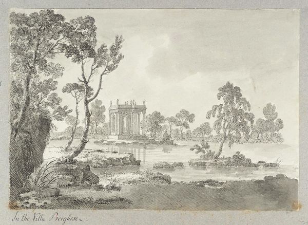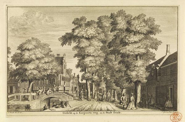 Editor: This is Jean Jacques Leveau's "View of Gilbrug, Outside of Utrecht," from the 18th century. The etching has a detailed, almost dreamlike quality. What symbols or deeper meanings do you see in this landscape? Curator: Notice how the central tree dominates the scene, a potent symbol of nature's enduring presence. The figures in the foreground, engaged in mundane tasks, remind us of the cyclical rhythm of life. Do you see any indications of power or privilege? Editor: Yes, the grand house in the background speaks to wealth, but it's partially obscured by the natural landscape. Curator: Precisely. The tension between nature and societal structures, between the fleeting actions of individuals and the timelessness of the land, echoes a universal theme. This work invites us to reflect on our place within a much larger framework. Editor: I see it now – a reflection on time, nature, and society’s structures. Curator: Indeed, and the enduring power of symbols to convey complex ideas.