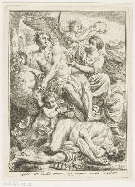 Arnold Houbraken rendered this watercolor and gouache work depicting Hercules at the crossroads. Here, we see Hercules caught between the allegorical figures of Virtue, in armor, and Pleasure, surrounded by cupids and earthly delights. The scene pulses with the tension of choice, a theme that has preoccupied artists and philosophers for centuries. Note the theatrical gestures, reminiscent of classical sculpture. Virtue's firm hand on Hercules' shoulder echoes the stoic ideals of antiquity, while Pleasure's inviting embrace and the playful cupids evoke a sense of carefree abandon. These motifs find their echoes in Renaissance paintings, where similar figures guide the viewer's moral compass. The composition itself is a mirror of our own internal struggles, those opposing forces that tug at our souls. Consider how the symbolism of Hercules, the hero, is often adopted to convey the battle between moral duty and hedonistic temptation across time. Such visual representations tap into a reservoir of collective memory, offering a glimpse into our own subconscious desires and aspirations. It highlights the cyclical nature of human experience.