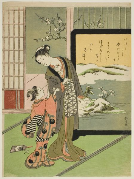 Curator: Suzuki Harunobu’s woodblock print, “Poem by Minamoto no Saneakira Ason, from an untitled series of Thirty-Six Immortal Poets,” made around 1767 or 1768, captures a serene moment. What are your initial thoughts? Editor: I’m immediately struck by the contrast between the woman's delicate form and the flat, almost graphic quality of the landscape. The limited color palette also contributes to its stillness; it's very calm, meditative. Curator: That stillness is quite intentional, I believe. This work belongs to the ukiyo-e tradition, a genre deeply entwined with the socio-cultural fabric of Edo-period Japan. We see the rising merchant class finding pleasure in these depictions of everyday life, celebrated actors, courtesans, and even classic poetry reinterpreted in modern settings. Editor: Yes, I see that tension between classical themes and contemporary representation in the woman's elegant pose and the surrounding geometric architecture. How do these formal devices emphasize the underlying themes? Curator: Note how she's framed by both indoor and outdoor space—a suggestion, perhaps, of the liminal spaces women occupied in Japanese society at that time. The poem inscribed in the sky above her speaks of longing and lost love. Harunobu is drawing a parallel between the woman's personal experience and a larger historical narrative. Her elegant clothing subtly reflects the societal expectations, gender roles, and complex social stratification of the time. Editor: I find the compositional choices equally fascinating. The division of space, with its stark horizontals, flattens perspective. It draws the viewer’s eye to a dialogue between pattern, like on her kimono, and plane, evident in the constructed environment she inhabits. It seems like a delicate interplay of texture and surface. Curator: Exactly. It speaks volumes about how the artist skillfully integrates multiple layers of meaning, reflecting on the ever-evolving roles and perceptions of women within the framework of tradition and modernity. The woman’s figure becomes a site where historical narratives intersect with contemporary life. Editor: I’ll remember that—a fusion of visual elements communicating the nuanced cultural context of this intriguing era. Curator: A fruitful insight indeed—illuminating the way artistic mastery can articulate profound social reflections.