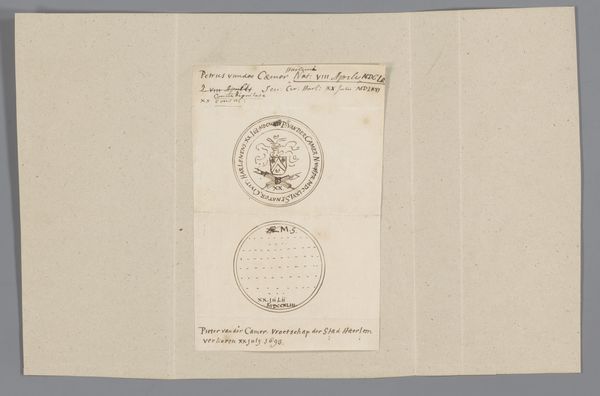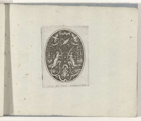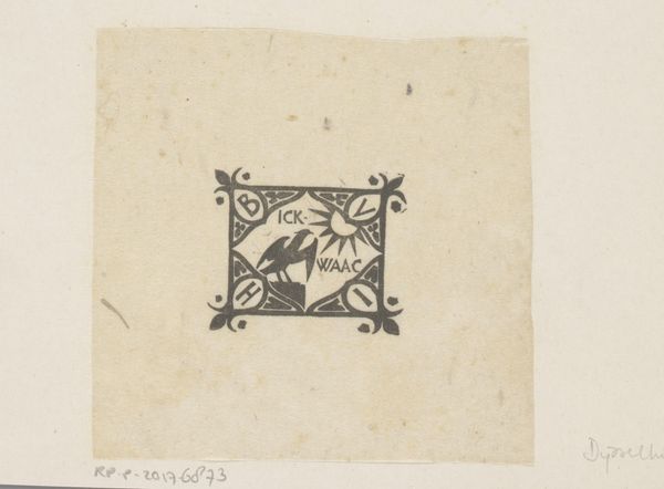 Curator: Here we have Julie de Graag's "Ontwerp voor een ex libris met een vogel en de initialen B.O.," a woodcut and ink drawing on paper created between 1887 and 1924, currently held in the Rijksmuseum collection. Editor: It’s a striking little emblem! The high contrast gives it a rather solemn air. And yet, those spiraling tendrils soften the austerity. What can you tell me about the design itself? Curator: It's a fascinating piece that intertwines the symbolism of the bird, common in the Art Nouveau and Symbolist movements, with the personal identity indicated by the initials "B.O." Think about how the image likely functioned. Who was "B.O.," and what did they stand for during the historical moment when women, like De Graag, were striving for visibility and agency in the art world? Editor: Indeed. Visually, the bird seems self-contained, framed not only by the black border but also those inward-curling lines. The initials almost seem like a signature branded on the creature itself. Do you think it possible this reflects ownership or perhaps constraint? It seems poignant given De Graag's own journey as a woman artist. Curator: I think that's a valid interpretation. We must consider that birds often signify freedom, flight, even transcendence, but here the bird is somewhat grounded, enclosed. Considering De Graag's political associations—her commitment to pacifism, for example—it can be viewed as the repression of free thought and action in the face of societal norms. Editor: Right. I hadn't considered her pacifism! In terms of its iconographic presentation, the heavy outlines remind me of medieval woodcuts; it taps into a long tradition, consciously or unconsciously. Yet the framing and bird itself become a stylized, Art Nouveau object, losing its original connection to the natural. It's been reborn into a symbol of intellectual containment, as you mentioned, or simply an indication of identity. Curator: It all becomes part of a multi-layered conversation: the symbolism of the natural world, personal identity, artistic freedom, and socio-political realities, distilled into one miniature work. Editor: De Graag manages to make the symbolic incredibly intimate through a restricted palette and delicate linework, encouraging us to think critically about historical power structures. Curator: An elegant design that belies complex and relevant social questions. Editor: Precisely. This small emblem proves art’s lasting ability to speak across time.