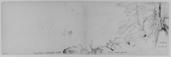 Curator: This delicate drawing, “Gate of the Highlands, Mohonk, 1871” by Daniel Huntington, offers a glimpse into the artist's sketchbook. Created with ink and pencil, it showcases his observation of the Hudson River Valley. What are your first impressions? Editor: It feels incredibly serene, almost hauntingly so. The stark lines against the off-white ground evoke a sense of quiet vastness, a stillness that almost borders on melancholic. It gives me a deep longing to see the landscapes the Hudson River School so aptly documented. Curator: The drawing is an interesting example of the Hudson River School's focus on capturing the sublime in nature, yet it’s a sketch rather than a finished painting. This begs the question, how does its status as a preliminary work influence our understanding of it? Editor: That's precisely the crux of its intrigue! It strips away the romantic idealization often found in paintings, exposing the bare bones of artistic vision. It offers a unique, almost intimate glimpse into Huntington's process. It seems also relevant to mention how the indigenous presence of this location became obscured by white colonial settlement and erasure during this period. Curator: The use of ink and pencil speaks to practicality. A sketch allows for a rapid translation of observation into form, which seems fundamental in the work. This materiality— the immediate relationship of hand to paper to place — also connects to the nineteenth-century landscape aesthetic linked to economic growth and land exploitation. Editor: It raises fascinating questions about power dynamics at play. While Huntington attempts to depict the beauty and sublimity, is he also implicated in a system of erasure? How do his choices of what to represent and what to leave out, reveal broader societal attitudes and impact marginalized people in America during this time? Curator: Seeing it as an artifact connected to both aesthetic appreciation and potential erasure certainly complicates the traditional view. It prompts us to ask questions about representation and the responsibilities artists hold. Editor: Absolutely. And in considering this dialogue between aesthetics and historical context, it highlights the critical importance of examining art through a wider socio-political lens. The landscape becomes more than a vista, but an entry point into a complex web of interconnected experiences and historical processes.