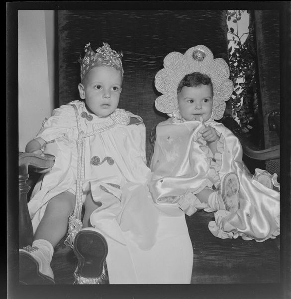Curator: This photograph, "Twins. Studio Shehrazade, Saida, Lebanon, 1950s," is part of Akram Zaatari's exploration of the archive of Lebanese photographer Hashem el Madani. Editor: It's a stark image. The contrasting textures, the hard backdrop against the soft fur, make the babies’ gaze even more intense. Curator: Madani documented a rapidly modernizing Lebanon, and photographs like this reveal the social aspirations and studio culture of the time. Editor: I'm struck by the formality. Their posed expressions, the elaborate bib and blanket, create a tension with the subjects' vulnerability. Curator: Zaatari’s curation brings to light how photography served as a tool for constructing identity and preserving memory within a specific cultural context. Editor: Seeing those faces, framed by those objects, freezes a particular moment in time that we can now examine more closely. Curator: Precisely, it allows us to consider the role of the photographer in shaping our understanding of history. Editor: And to appreciate the power of a simple image to evoke such complex emotions.